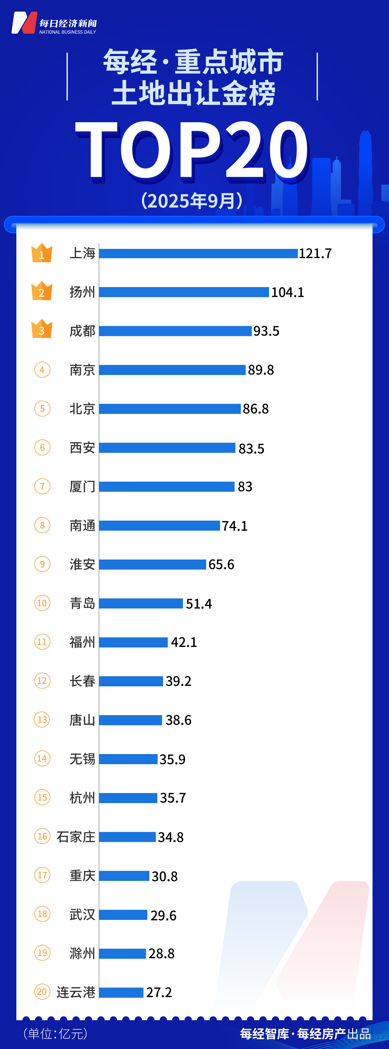 9月,上海土地出让金达到121.7亿元,领跑TOP20城市;扬州、成都、南京等城市均有所表现,TOP20城市合计土地出让金约1196.2亿元。