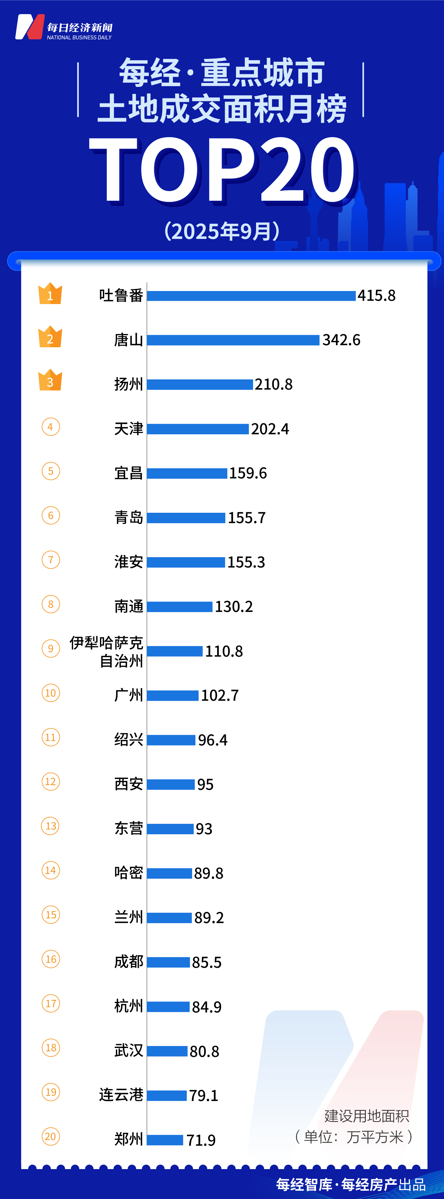9月,TOP20城市建设用地面积合计成交达2851.5万平方米,超越4月份(2845.7万平方米)成为年内新高。
