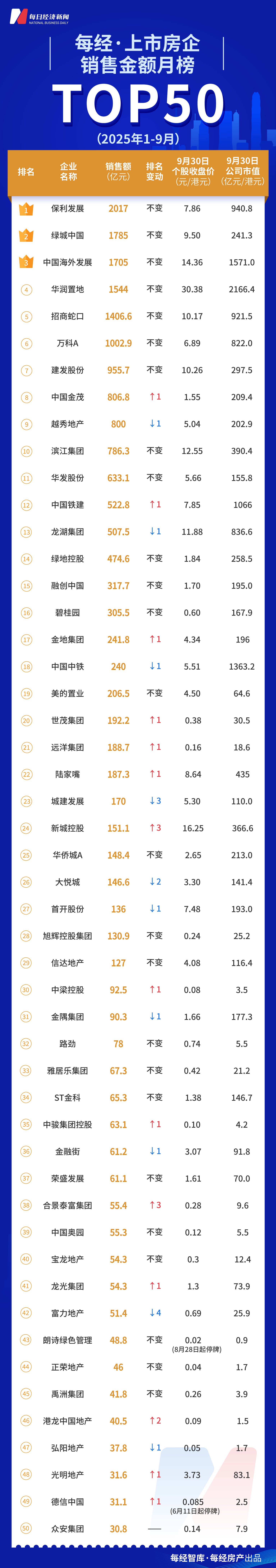 每经数读 | 前三季度TOP50上市房企排名激烈争夺