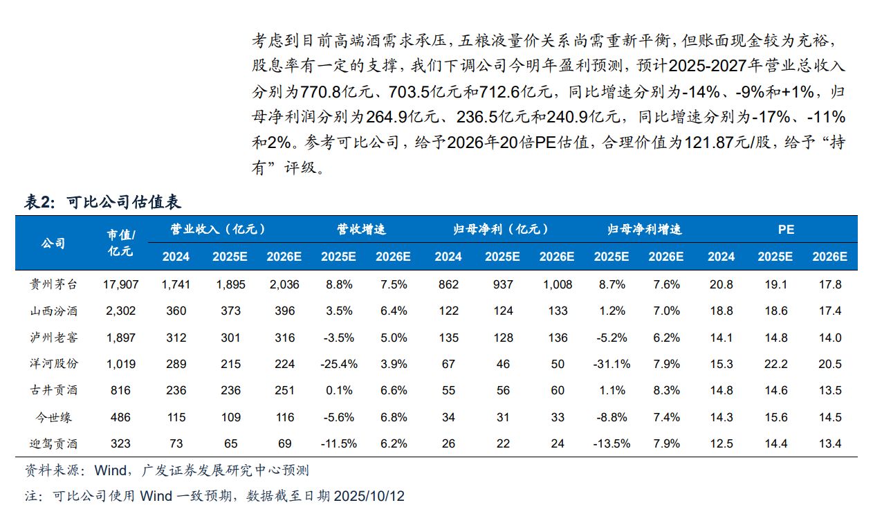 与此同时,广发证券还发布了题为《五粮液(000858.SZ)量价需再平衡,下调今明年盈利预测》的研报。