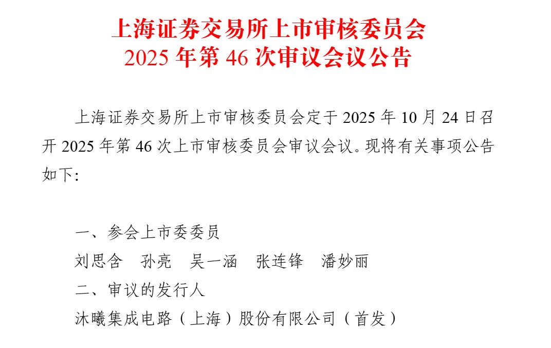 根据上交所公告,上交所上市审核委员会定于2025年10月24日召开2025年第46次上市审核委员会审议会议,将审议发行人沐曦集成电路(上海)股份有限公司(以下简称沐曦股份)的首发申请。