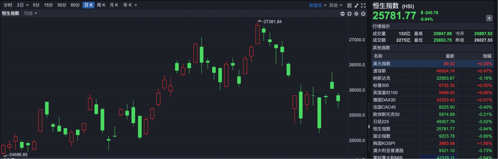 截至收盘,恒指报收于25781.77点,下跌245.78点,跌幅0.94%。