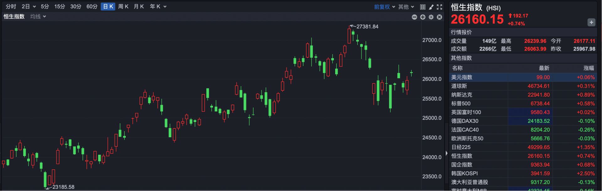 截至收盘,恒指报收于26166.03点,上涨198.05点,涨幅0.74%。