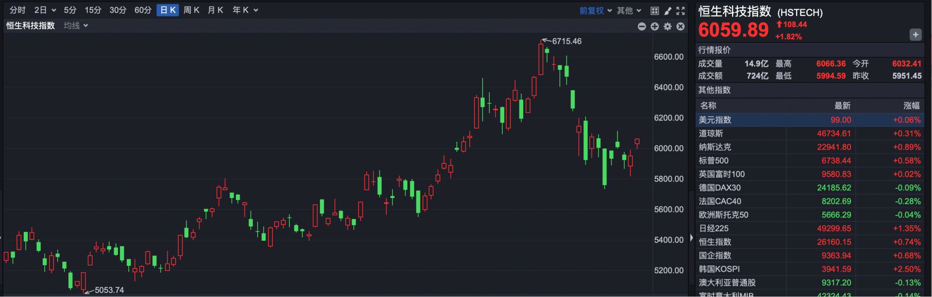 恒生科技指数报收于6059.89点,上涨108.44点,涨幅1.82%。