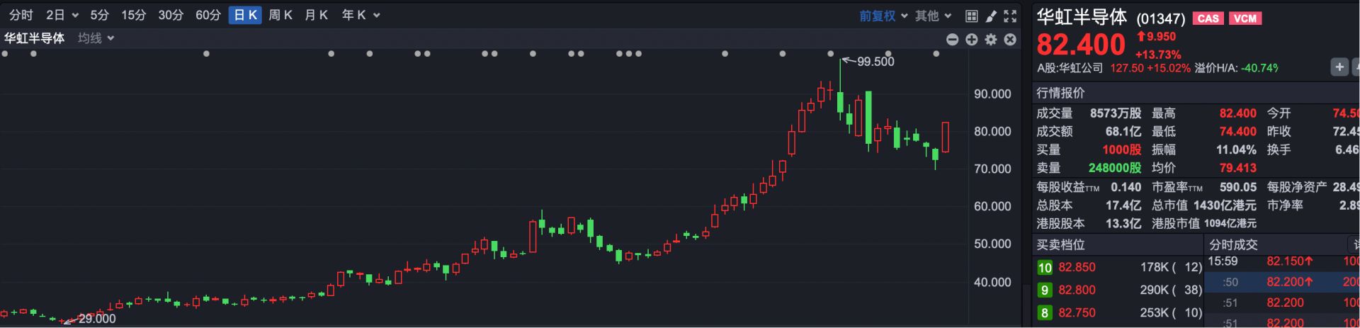 市场热点方面,半导体全线大涨。其中,华虹半导体(01347.HK)涨超13%,中芯国际(00981.HK)、ASMPT(00522.HK)涨超8%,英诺赛科(02577.HK)、上海复旦(01385.HK)涨超5%。