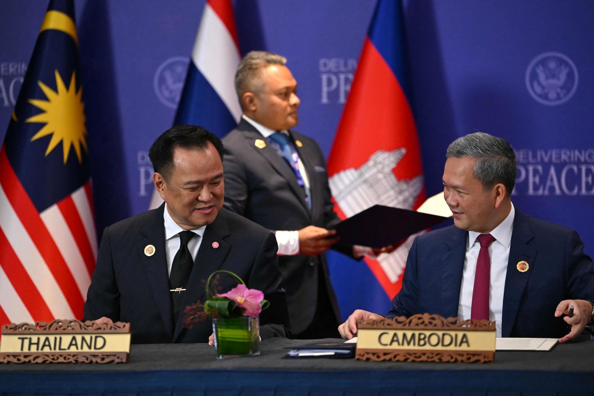 当天,正在马来西亚吉隆坡出席第47届东盟峰会的泰国总理阿努廷与柬埔寨首相洪玛奈共同签署声明。声明包括泰柬和平四项协议:撤除重型武器、清除地雷、打击诈骗集团、共同管理边境。