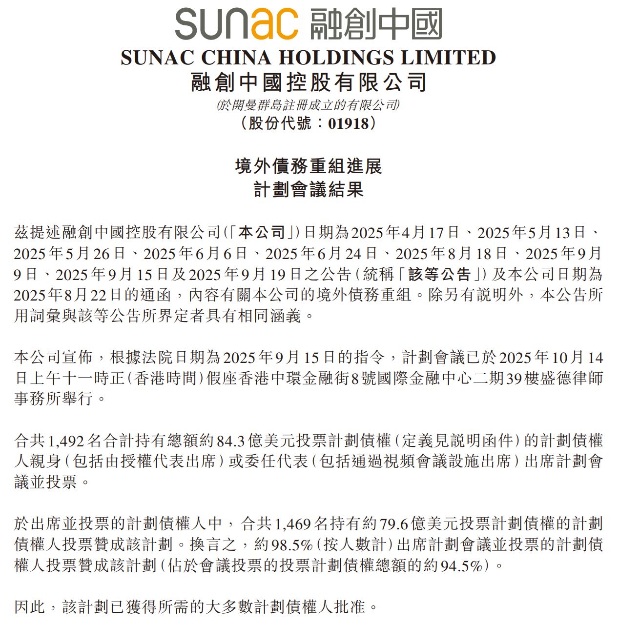 融创中国方面表示,鉴于本次表决结果超过75%金额门槛,已满足法院批准的核心要求,方案随之将迎来法院批准流程。公告明确,香港高等法院将于11月5日举行聆讯,对其重组方案作出最终裁决。这意味着,融创中国距离重组方案彻底通关仅“一步之遥”。