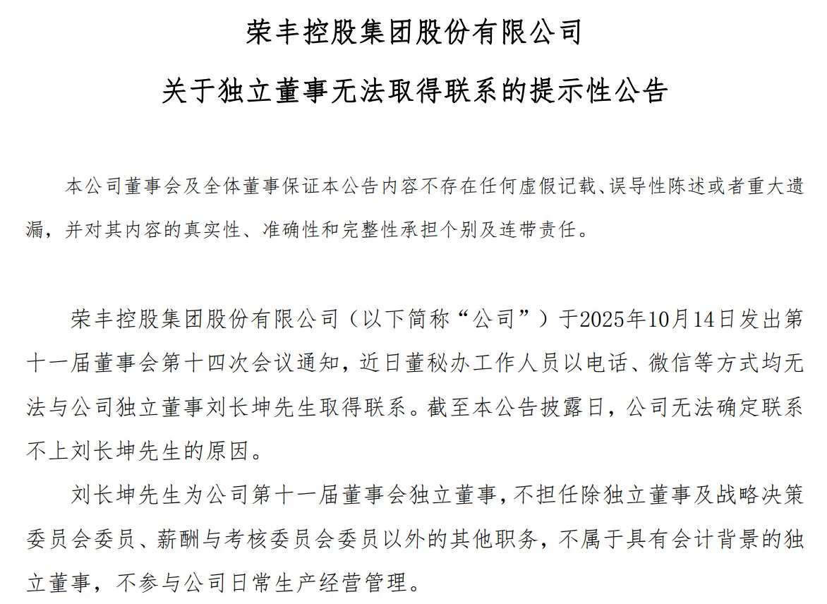10月26日下午,*ST荣控(即荣丰控股,000668.SZ,股价11.00元,市值16.15亿元)发布了一则关于独立董事无法取得联系的提示性公告。