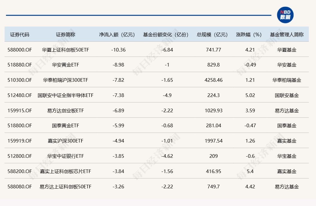 与此同时,华夏上证科创板50ETF基金份额减少6.84亿份,净流出额为10.36亿元;华安黄金ETF基金份额减少1.00亿份,净流出额为8.98亿元;华泰柏瑞沪深300ETF基金份额减少1.65亿份,净流出额为7.82亿元。