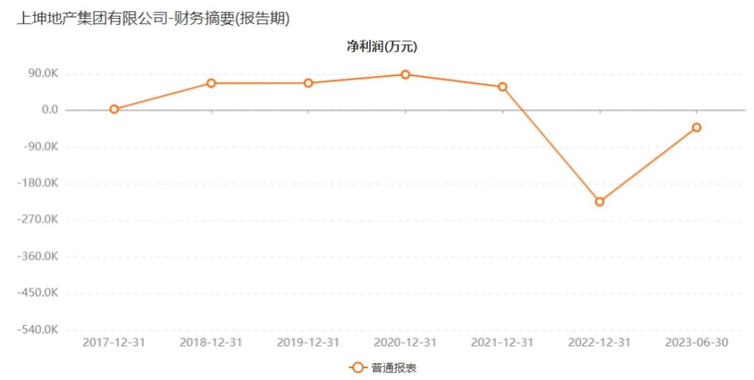 从Choice平台图表可见,上市之后的2020年,上坤地产净利润达到了近年来最高点,约8.9亿元,同比增长超过30%,但随后就出现了快速下降。2021年净利润为5.8亿元,2022年由盈转亏,为-22.43亿元;2023年上半年净亏损大幅缩小,此后再无公开财务信息。