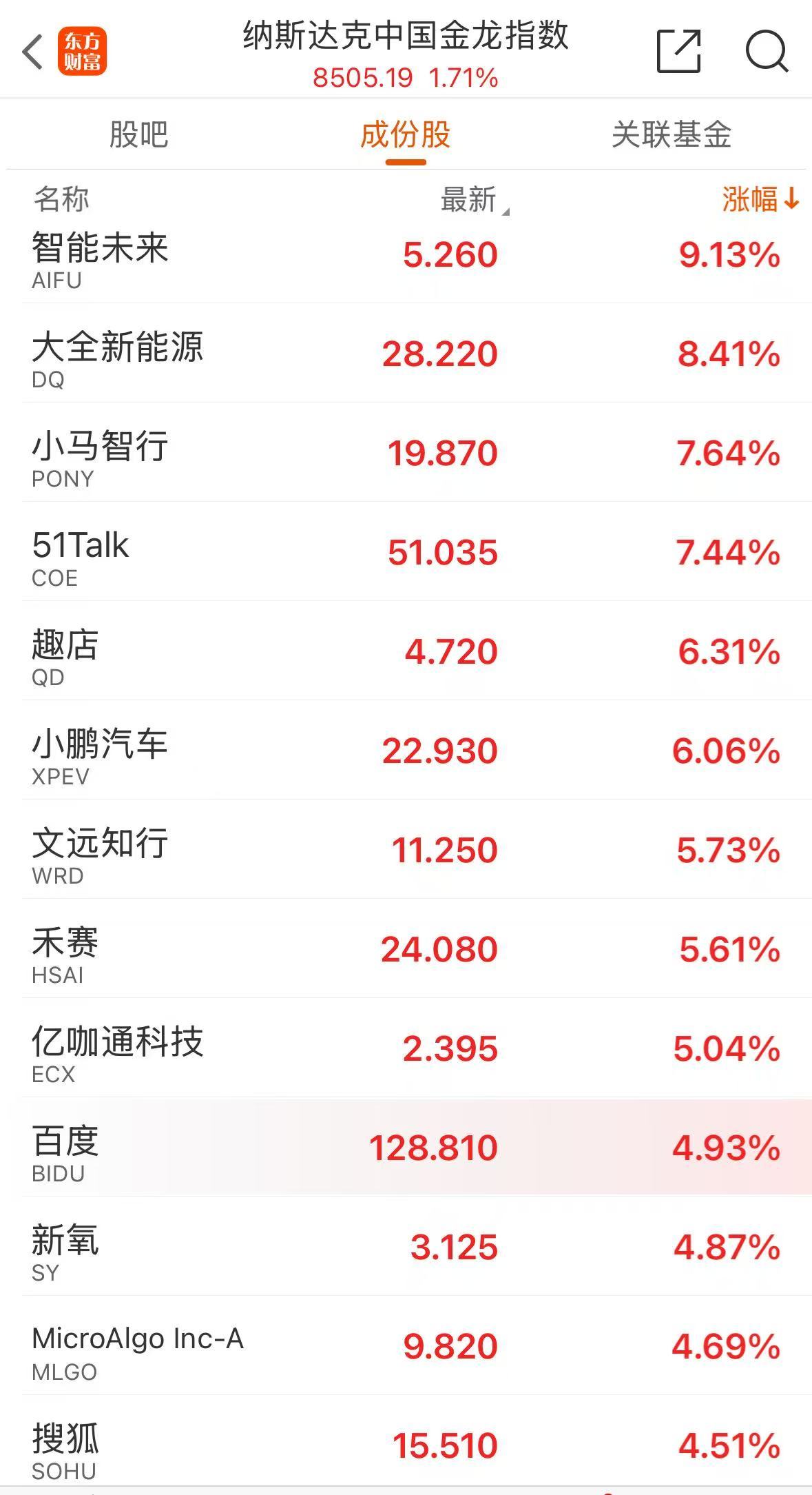 中概股方面,纳斯达克中国金龙指数一度涨近2%,明显强于美股,个股方面,截至发稿,智能未来涨超9%,大全新能源涨超8%,小马智行、51Talk涨超6%。