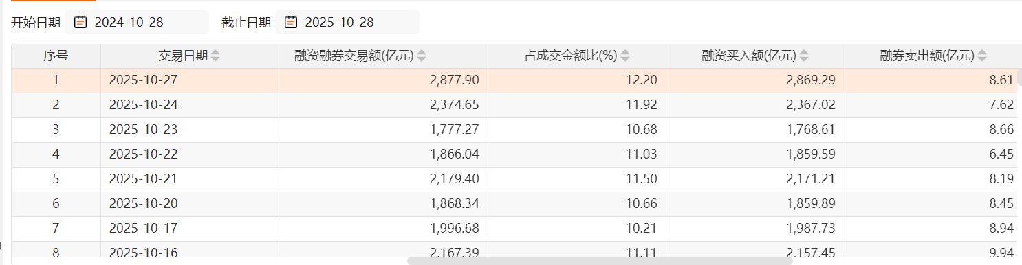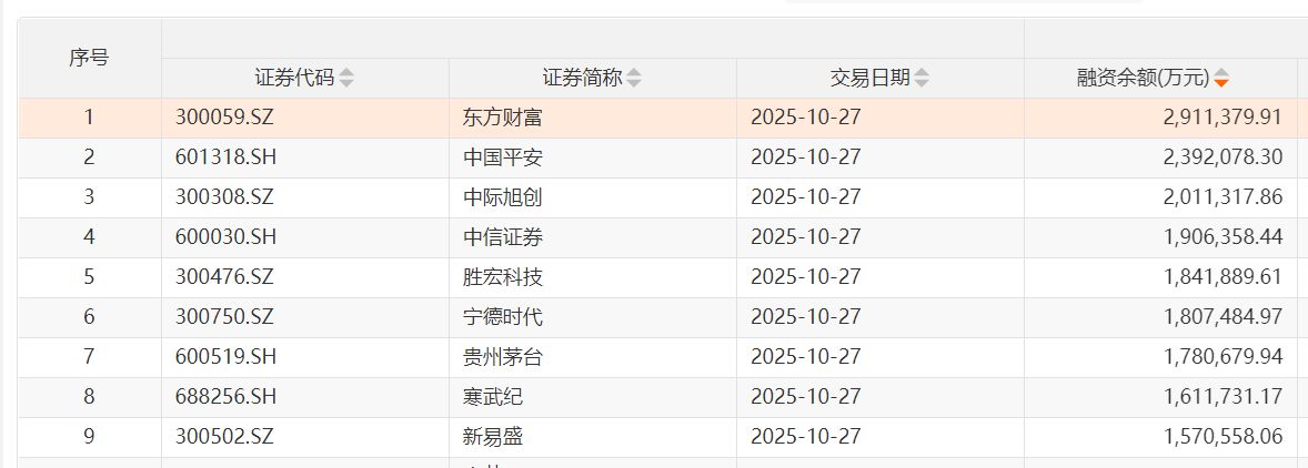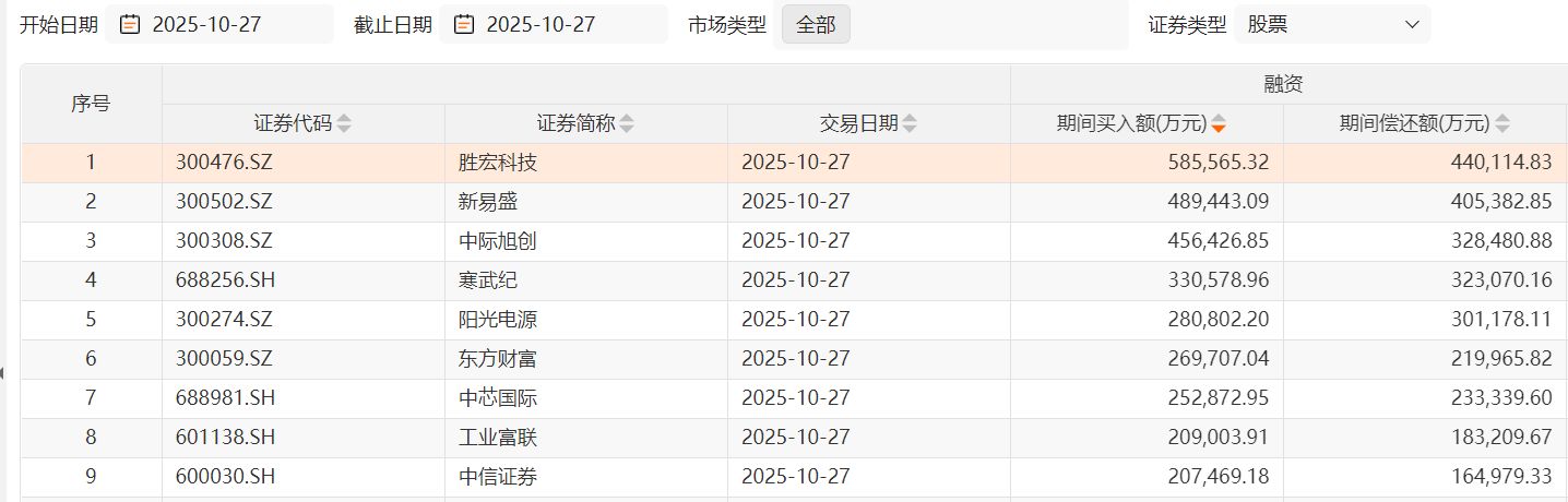 个股方面,科技板块仍是融资者追逐的主角。10月27日,胜宏科技被融资买入58.56亿元居首;新易盛、中际旭创分别以48.94亿元、45.64亿元紧随其后;寒武纪被融资买入33.06亿元,位列第四。值得一提的是,在沪指冲关过程中,两只券商股也获得了融资者关注,东方财富、中信证券当天分别被融资买入26.97亿元和20.75亿元。