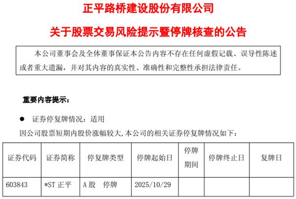明起再度停牌核查!“29天21板”*ST正平:公司股价已严重脱离基本面,连续涨停期间已累积巨大交易风险
