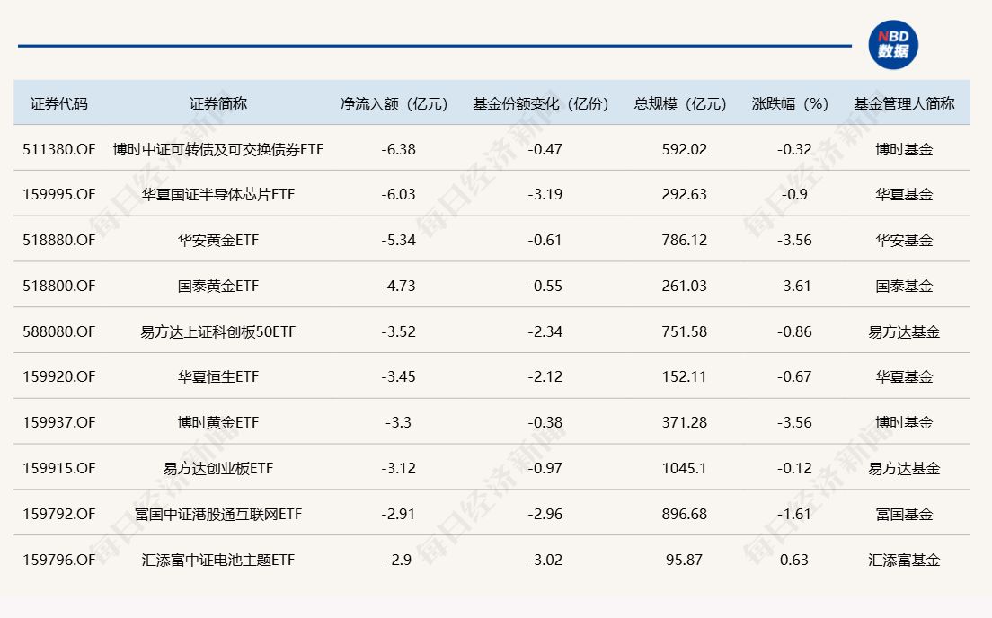 与此同时,博时中证可转债及可交换债券ETF基金份额减少0.47亿份,净流出额为6.38亿元;华夏国证半导体芯片ETF基金份额减少3.19亿份,净流出额为6.03亿元;华安黄金ETF基金份额减少0.61亿份,净流出额为5.34亿元。