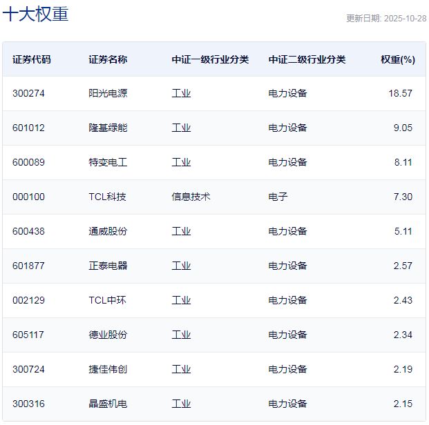 中证光伏产业指数(931151.CSI)发布于2019年4月22日,从沪深市场主营业务涉及光伏产业链上、中、下游的上市公司证券中,选取不超过50只最具代表性的上市公司证券作为指数样本,以反映沪深市场光伏产业上市公司证券的整体表现。