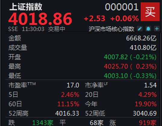 10月30日,A股窄幅整理,上证指数午盘涨0.06%报4018.86点,深证成指跌0.02%,创业板指跌0.23%,沪深300涨0.13%,北证50涨2.05%,科创50跌0.42%,中证A500涨0.04%。A股半日成交1.56万亿元。