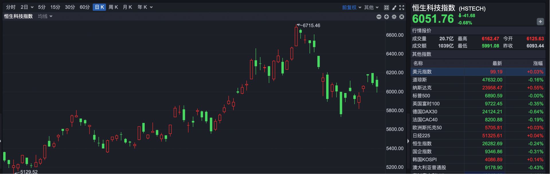 恒生科技指数报收于6051.76点,下跌41.68点,跌幅0.68%。