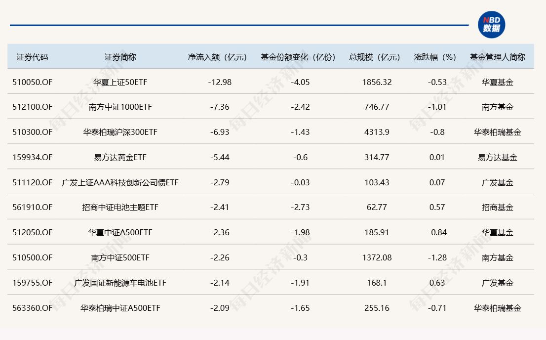 与此同时,华夏上证50ETF基金份额减少4.05亿份,净流出额为12.98亿元;南方中证1000ETF基金份额减少2.42亿份,净流出额为7.36亿元;华泰柏瑞沪深300ETF基金份额减少1.43亿份,净流出额为6.93亿元。
