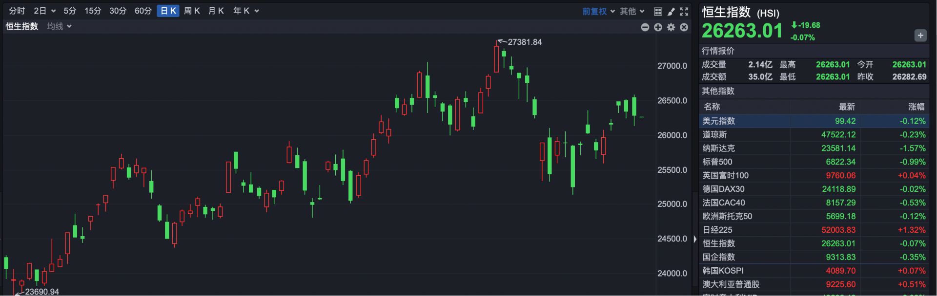 截至发稿,恒生指数开盘报26263.01点,下跌19.68点,跌幅0.07%。