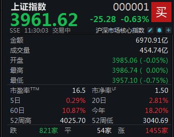 10月31日,A股震荡走低,前期强势科技股多数回调。截至上午收盘,上证指数跌0.63%报3961.62点,深证成指跌0.62%,创业板指跌1.49%,沪深300跌1.02%,北证50涨3.43%,科创50跌2.51%,中证A500跌0.8%。A股半日成交额1.58万亿元。