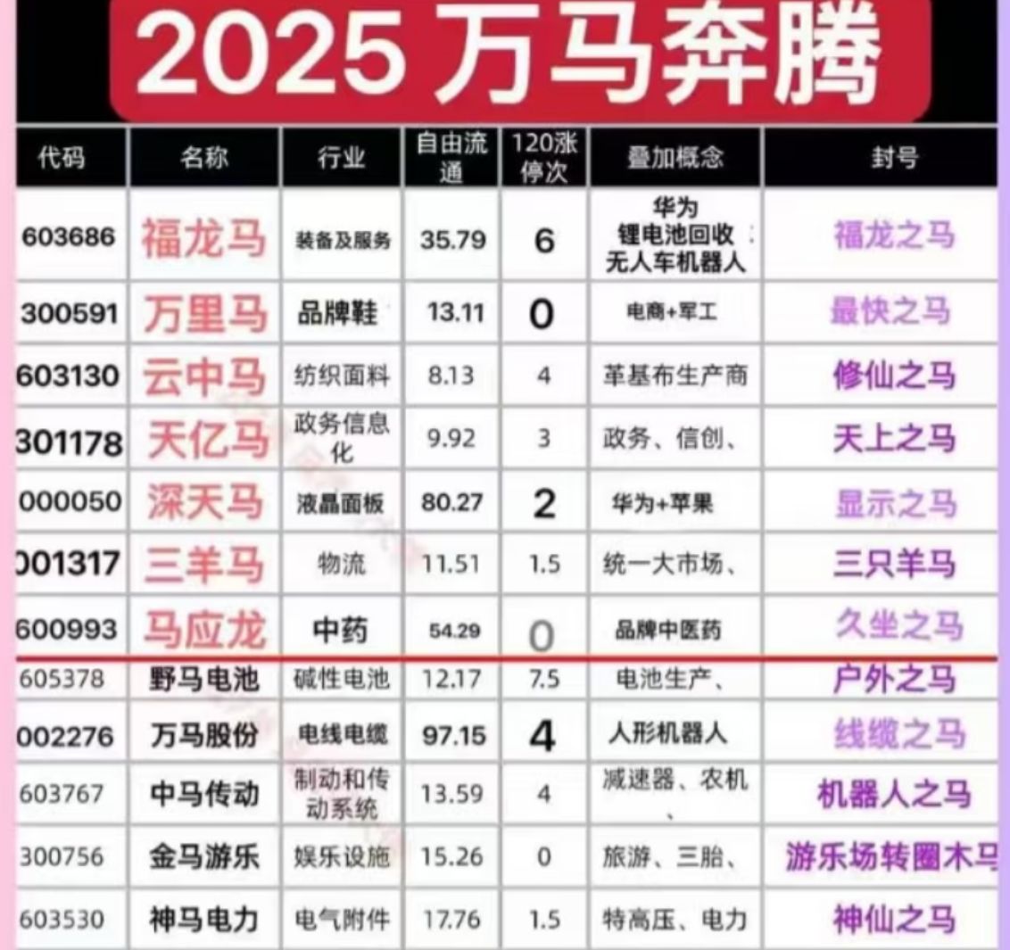 还有博主针对市场心理,精选了一批不仅名字里有“马”,而且能契合当前机器人、AI、储能、创新药等热门题材的概念股。