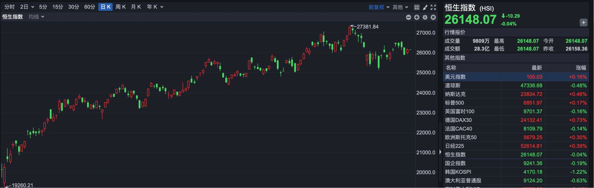 截至发稿,恒生指数开盘报26148.07点,下跌10.29点,跌幅0.04%。