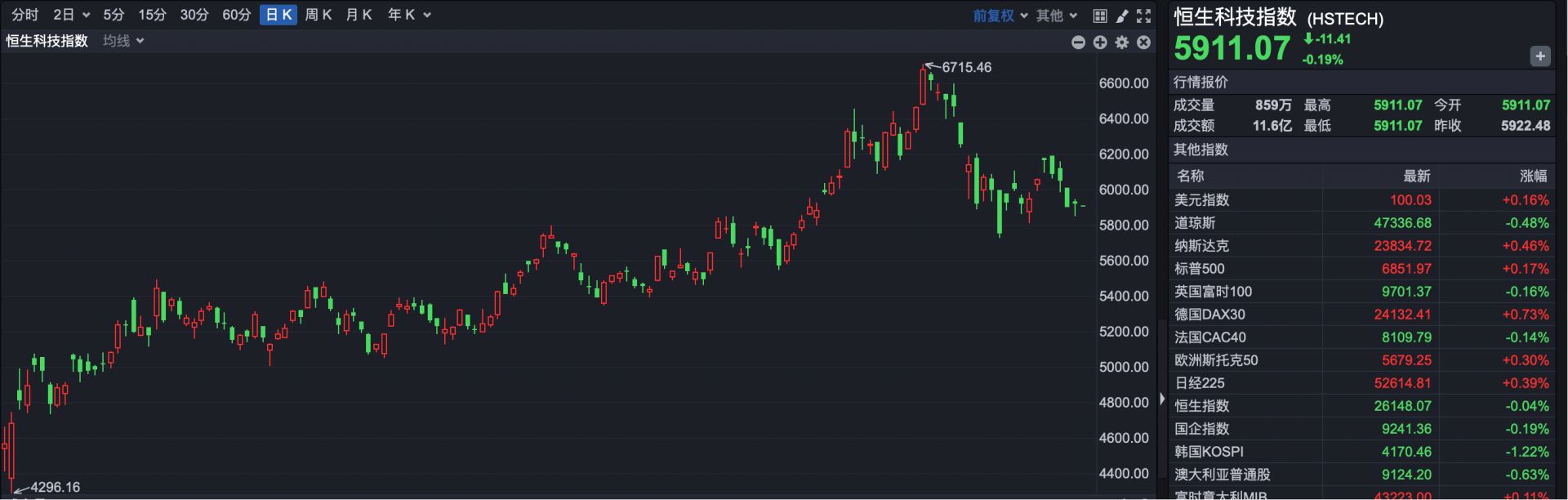 恒生科技指数开盘报5911.07点,下跌11.41点,跌幅0.19%。
