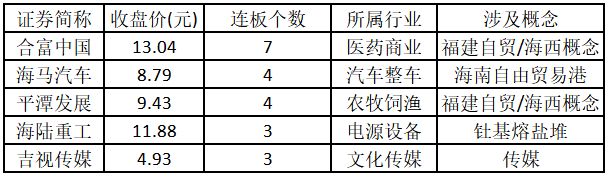 从连板情况来看,今日首板个股有48只;2连板的个股有11只;3连板及以上的个股有8只。今日连板数排名前5的个股包括合富中国、海马汽车、平潭发展、海陆重工、吉视传媒,具体如下表所示。