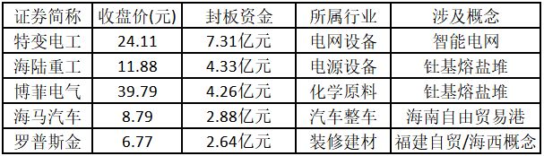 从封板资金来看,今日涨停板个股中,封板资金排名前5的个股包括特变电工、海陆重工、博菲电气、海马汽车、罗普斯金。