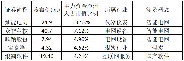 主力资金净流入金额占市值比例排名前5的个股分别为灿能电力、众智科技、顺钠股份、宝泰隆、浪潮软件。