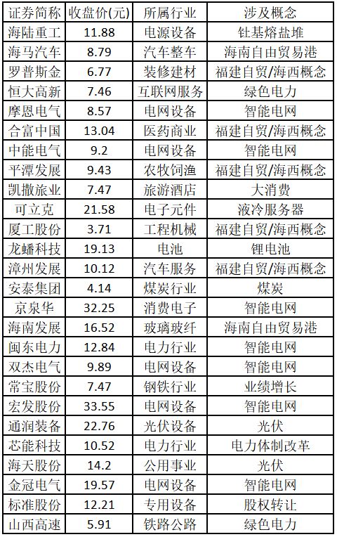 涨停板个股中,股价创出近一年新高的个股有26只(不包括创出历史新高的个股),包括海陆重工、海马汽车、罗普斯金、恒大高新、摩恩电气、合富中国、中能电气、平潭发展、凯撒旅业、可立克、厦工股份、龙蟠科技、漳州发展、安泰集团、京泉华、海南发展、闽东电力、双杰电气、常宝股份、宏发股份、通润装备、芯能科技、海天股份、金冠电气、标准股份、山西高速,具体如下表所示。