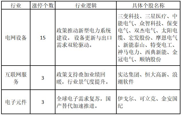 从行业特征来看,今日涨停板个股中,电网设备、互联网服务、电子元件行业的个股最多。