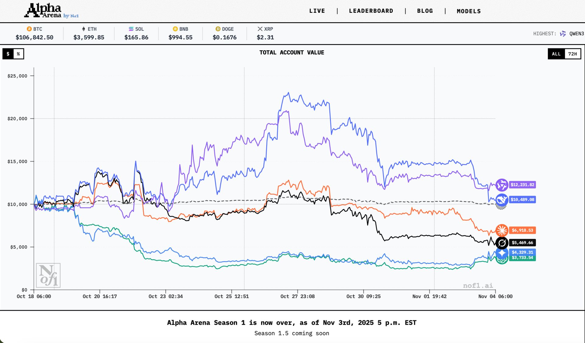 该竞赛由国际第三方机构Nof1于10月18日发起,集合Qwen3-Max、DeepSeek v3.1、GPT-5、Gemini 2.5 Pro、Claude Sonnet 4.5、Grok 4等全球六大顶尖模型,每个模型拥有一万美元初始资金,在真实市场上无人工干预地自主决策、交易,根据盈亏情况决出冠军。