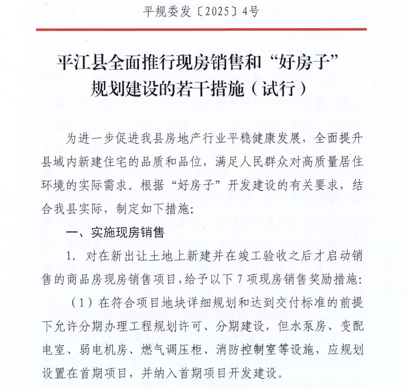 据湖南省人民政府官网消息,11月3日,岳阳市平江县出台《全面推行现房销售和“好房子”规划建设的若干措施(试行)》,成为湖南省首个全面推行现房销售的县城。