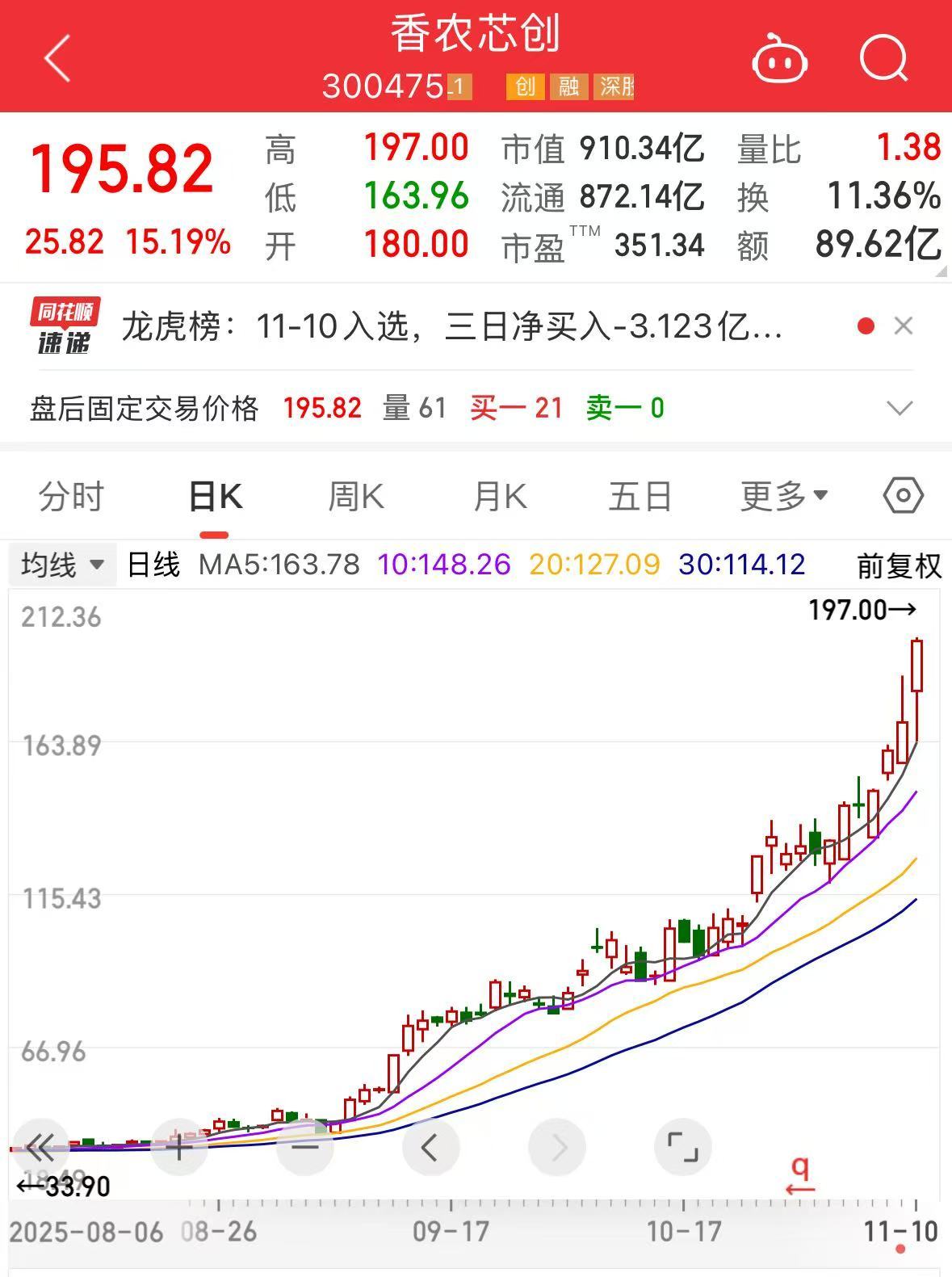 盘面上,香农芯创今日收盘涨15.19%,报195.82元/股,盘中最高触及197元/股,再创新高。该股近期股价不断刷新纪录,年初以来累计涨幅已超580%。