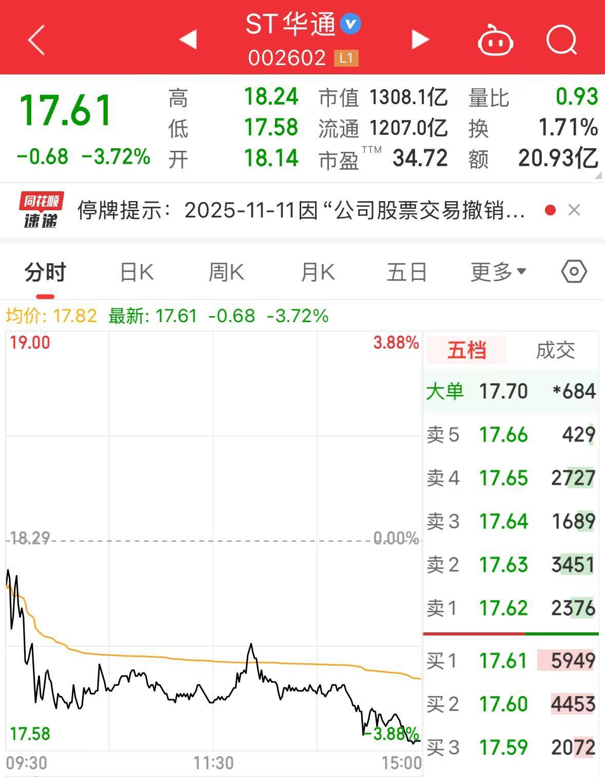截至11月10日收盘,ST华通跌3.72%,报17.61元/股,市值1308.1亿元。