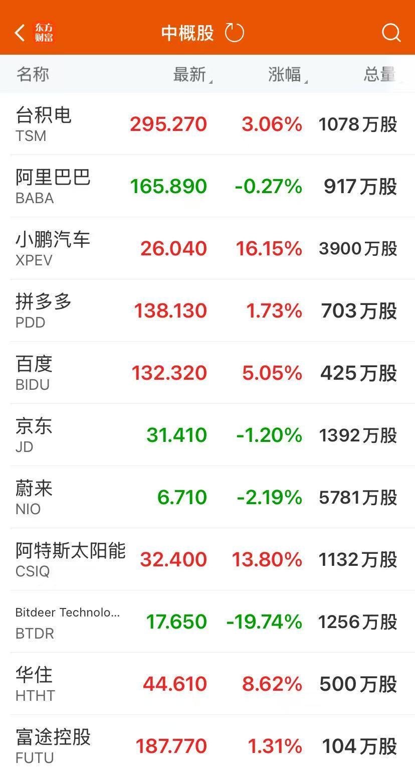 热门中概股普涨,纳斯达克中国金龙指数收涨2.25%,小鹏汽车涨超16%,百度涨超5%,老虎证券、微博涨超3%,爱奇艺涨超2%,拼多多涨超1%。