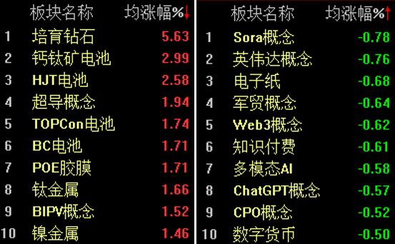 板块方面,光伏、储能概念反复活跃,拓日新能涨停,海博思创涨超10%,协鑫集成、科陆电子、京山轻机、国能日新等跟涨。超硬材料概念延续强势,四方达、沃尔德领涨,惠丰钻石、黄河旋风等大涨。