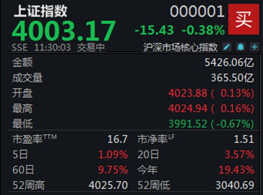 11月11日,A股震荡走低,截至上午收盘,上证指数跌0.38%报4003.17点,深证成指跌0.52%,创业板指跌0.74%,北证50跌0.19%,科创50跌0.72%,中证A500跌0.57%,A股半日成交1.27万亿元。
