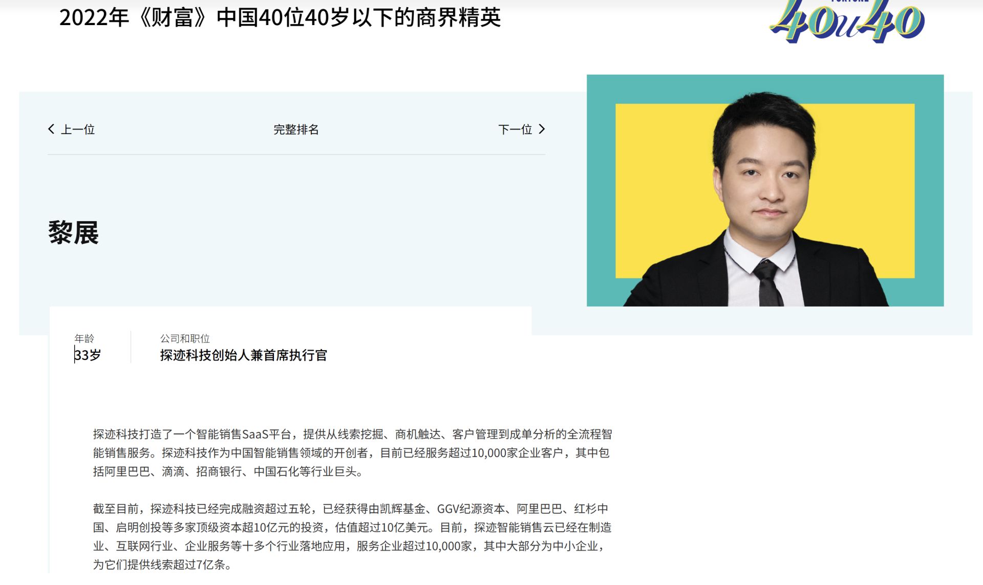 最引人注目的是2022年6月,黎展登上《财富》发布的“中国40位40岁以下的商界精英”榜单。在2022年的榜单中,与黎展共同上榜的还有字节跳动创始人张一鸣、SHEIN(希音)创始人兼首席执行官许仰天等知名企业家。