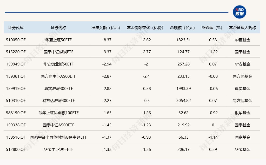 与此同时,华夏上证50ETF基金份额减少2.62亿份,净流出额为8.37亿元;国泰中证煤炭ETF基金份额减少2.77亿份,净流出额为3.37亿元;华安创业板50ETF基金份额减少2.00亿份,净流出额为2.94亿元。