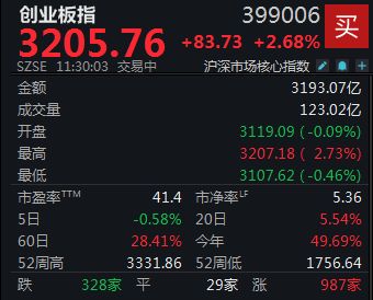 A股低开高走,创业板指半日大涨2.68%