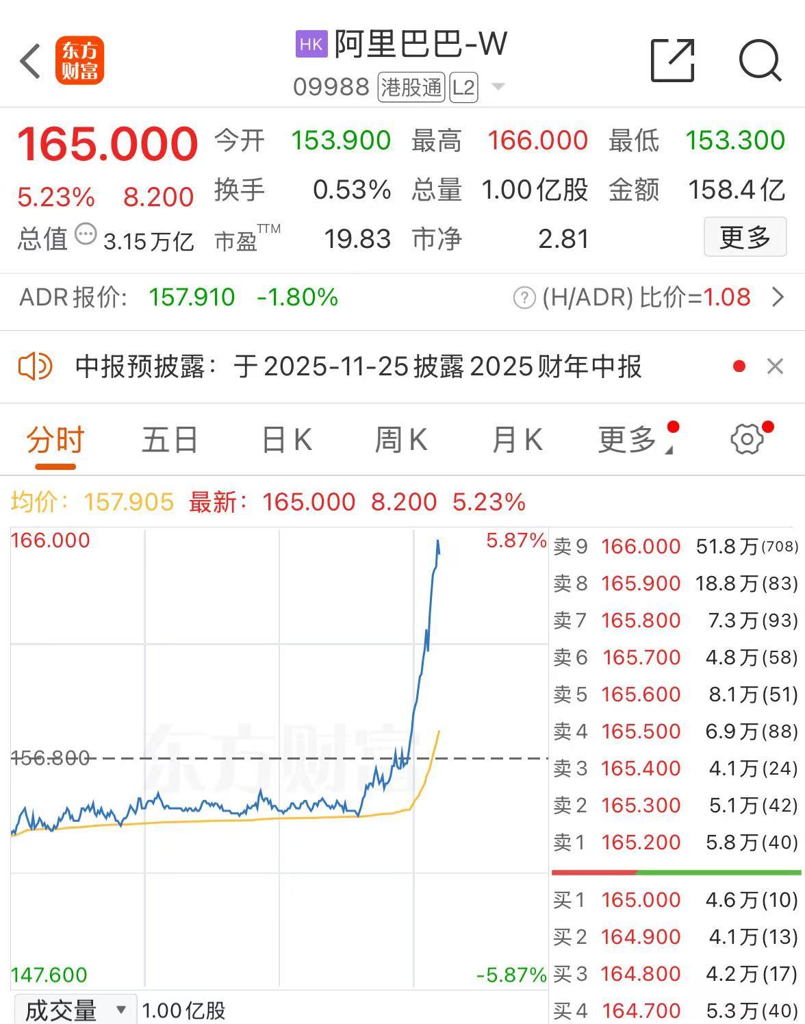 11月13日,阿里巴巴港股午后涨幅扩大至近6%,早盘一度跌近2%。