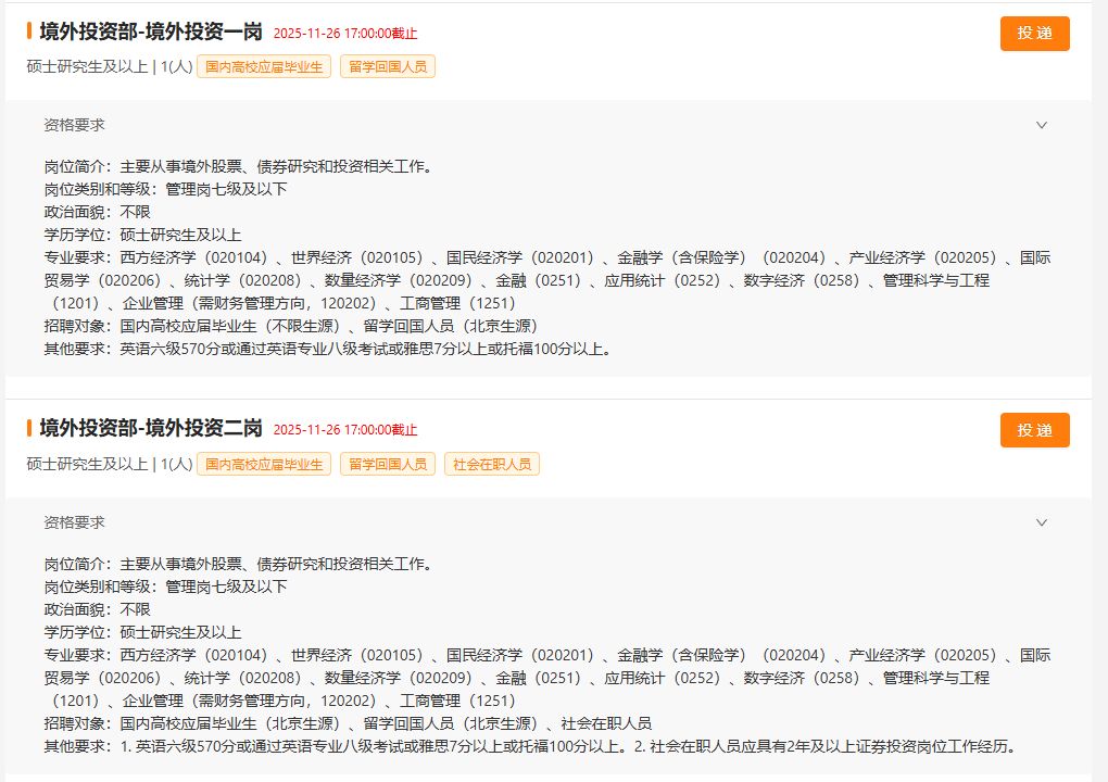 其中境外投资部,招聘境外投资一岗和境外投资二岗,都是主要从事境外股票、债券研究和投资相关工作,不过招聘对象上有区别,境外投资一岗接受国内高校应届毕业生(不限生源)应聘,境外投资二岗可接受国内高校应届毕业生(北京生源)应聘,同时也接受社会在职人员应聘。