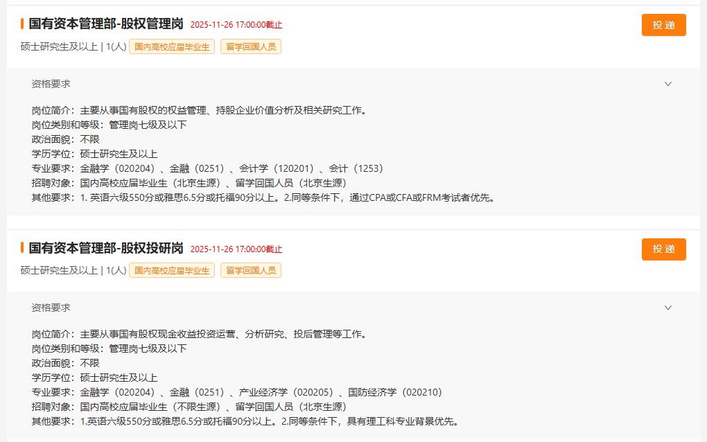 再看国有资本管理部,招聘股权管理岗,主要从事国有股权的权益管理、持股企业价值分析及相关研究工作;招聘股权投研岗,主要从事国有股权现金收益投资运营、分析研究、投后管理等工作。