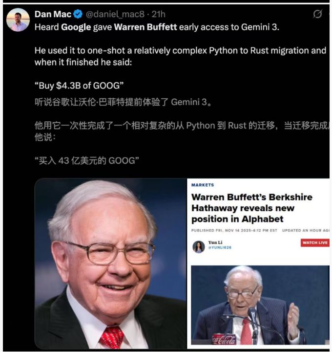另外比较有意思的点在于,坊间传闻,巴菲特之所以买谷歌,是因为他已经亲测Gemini 3.0 ,亲眼见证了一个复杂项目从Python 到Rust的一键迁移。巴菲特看完之后,当场买入了43亿美元的谷歌股票。从这一点来看,阿里启动千问项目,确实是值得资本期待的事情。