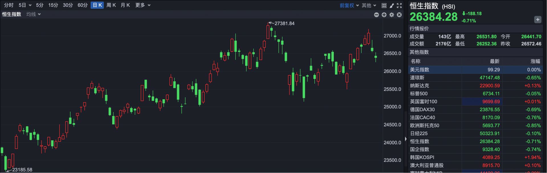 截至收盘,恒指报收于26384.28点,下跌188.18点,跌幅0.71%。