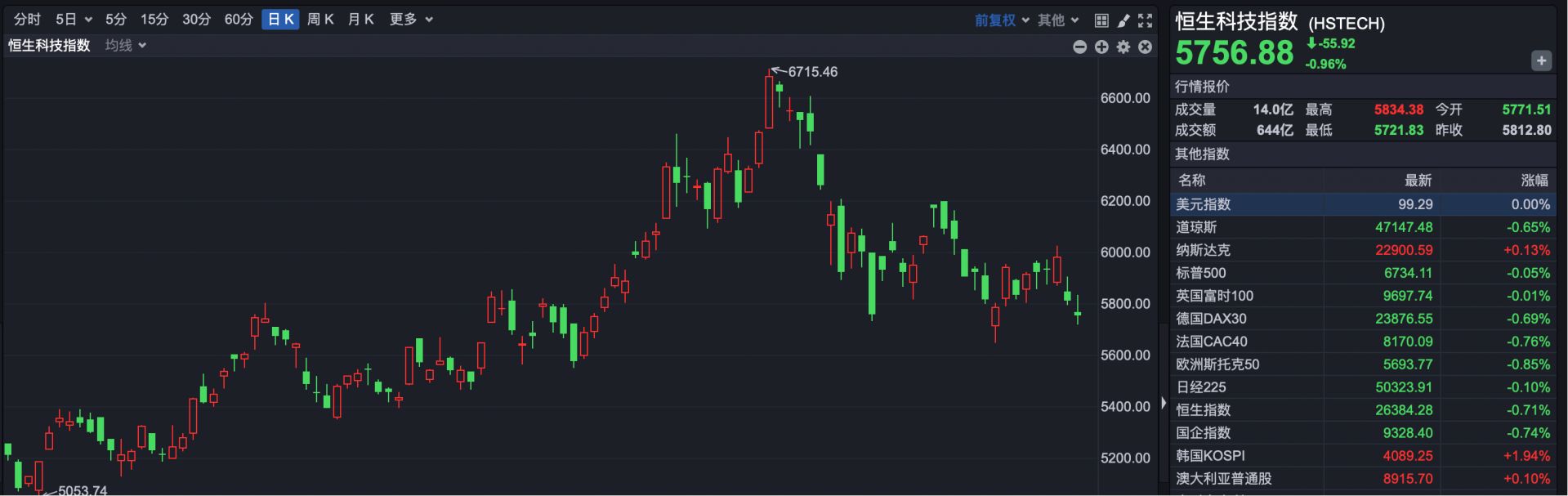 恒生科技指数报收于5756.88点,下跌55.92点,跌幅0.96%。