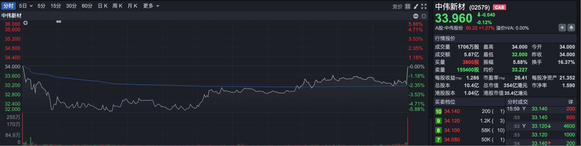 新股方面,中伟新材(02579.HK)上市交易,但遭遇破发。中伟新材发行价为34港元,但早盘阶段,中伟新材最大跌幅超过5%,最低报32港元。午后股价有所转强,尾市一度快速回升,但最终收盘报33.96港元,依旧下跌0.12%。