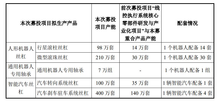 同时,本次募投项目与前次募投项目“线控执行系统核心零部件研发与产业化项目”存在部分产品重合,其中人形机器人丝杠(行星滚柱丝杠、微型滚珠丝杠)和智能汽车丝杠(汽车转向系统丝杠、汽车刹车驻车系统丝杠)为相同产品。前次募投项目产品可配套1万台人形机器人和35万台智能汽车,本次募投项目产品可配套7万台人形机器人和100万台智能汽车。